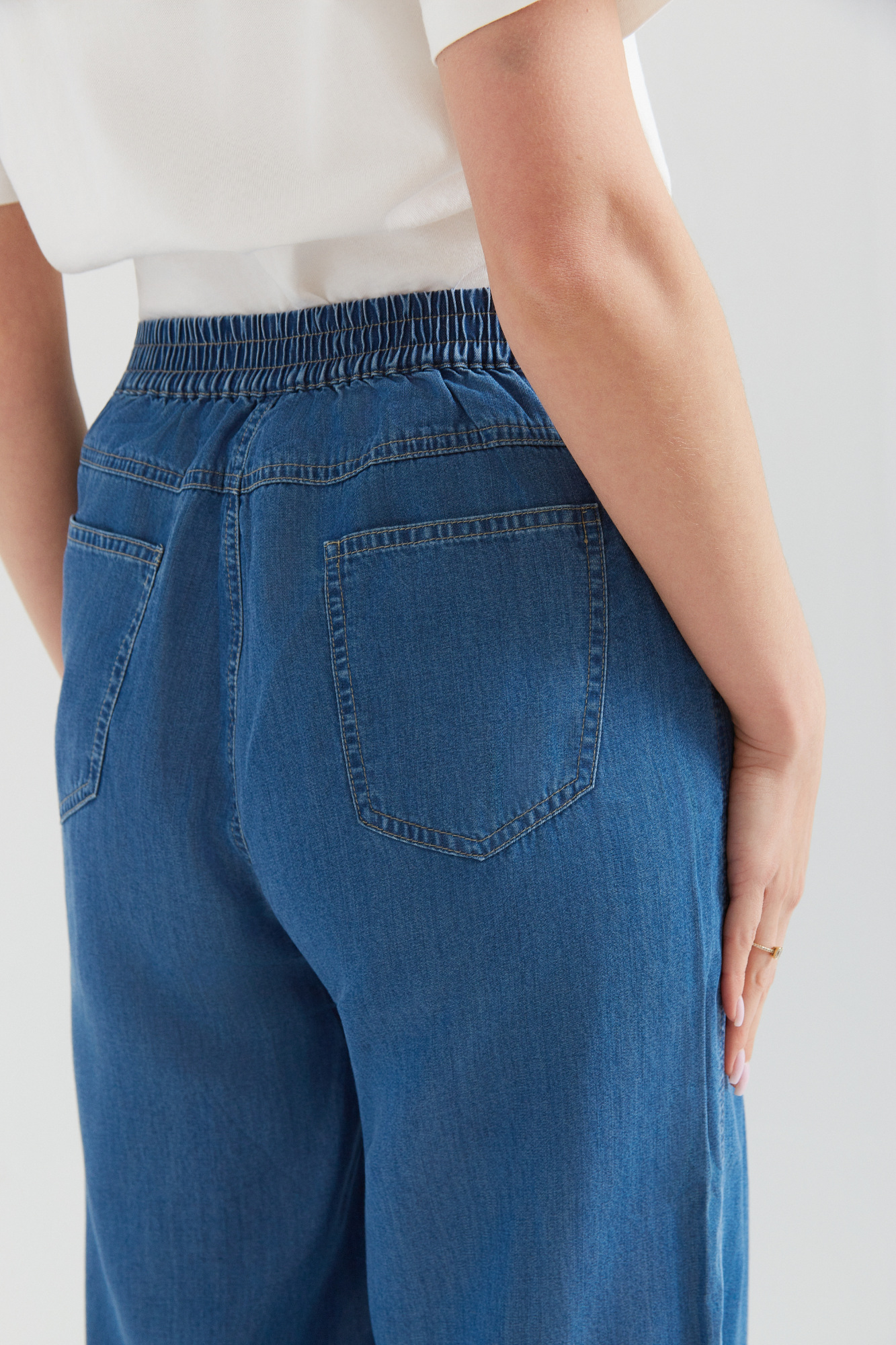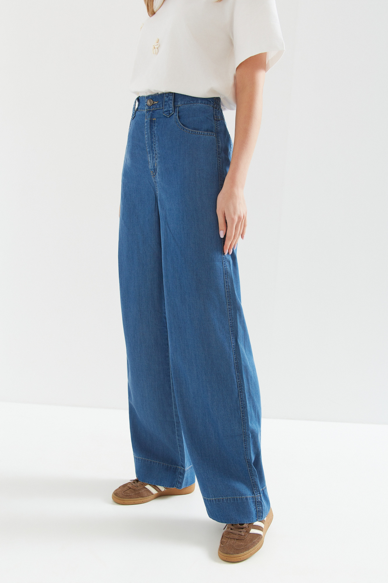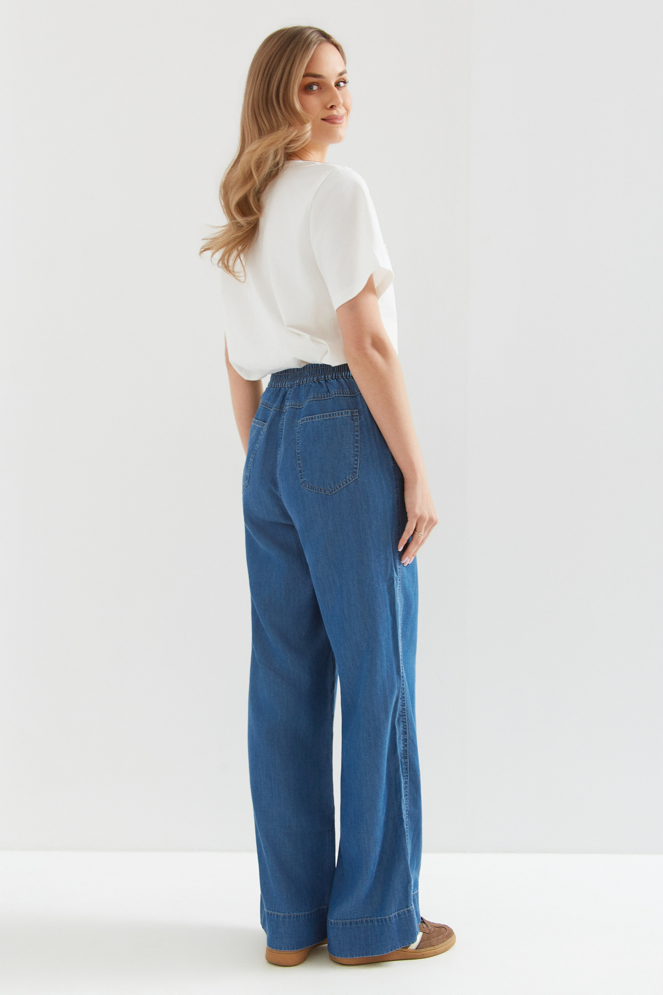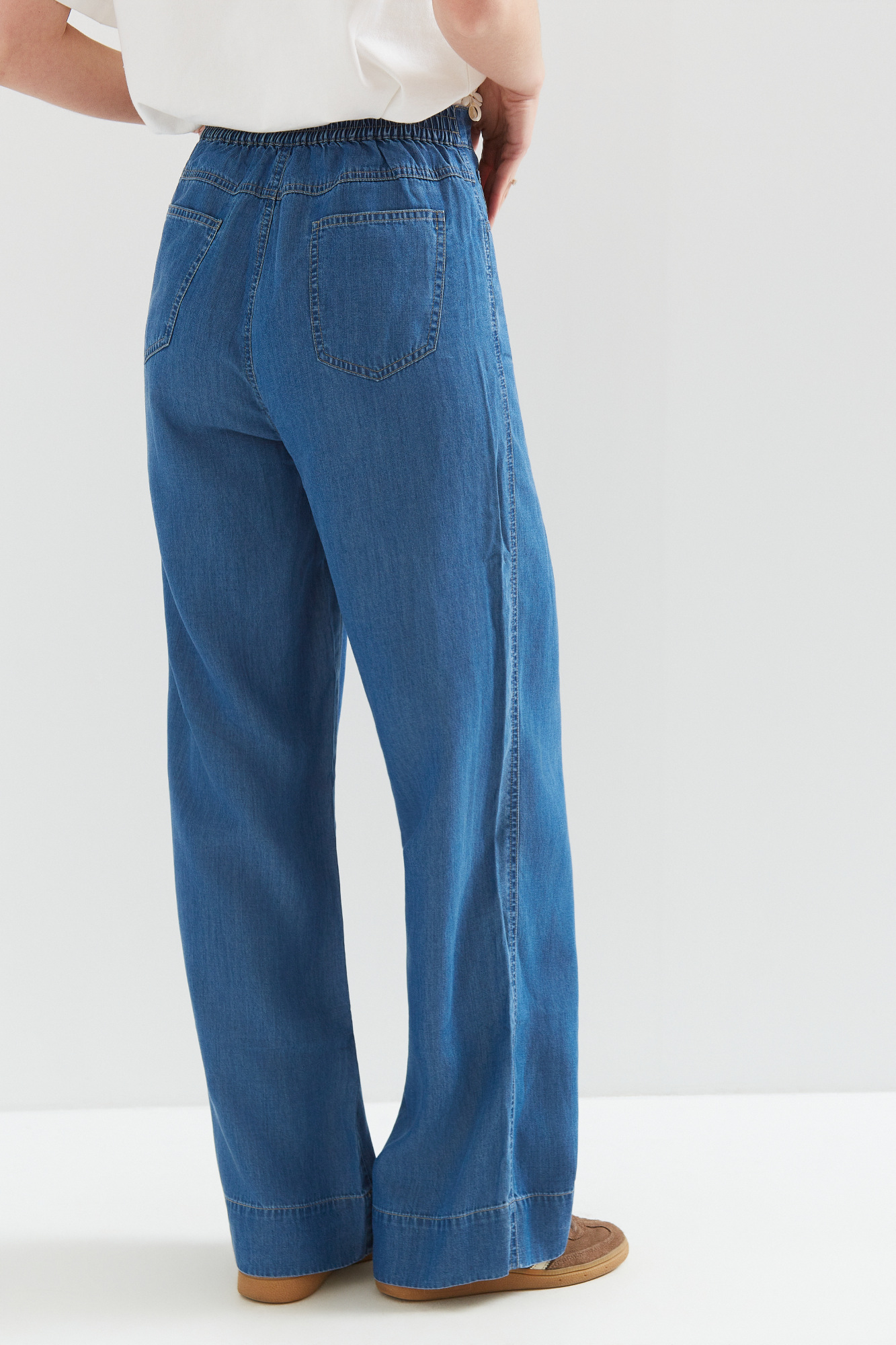 | Content | Spodnie z szerokimi nogawkami z lejącego cienkiego dżinsu (tencel nowoczesny ekologiczny materiał produkowany z celulozy drzewnej często eukaliptusowej), z wysokim stanem. Gumowa wstawka na tylnym pasku, gwarantuje wygodę w każdej sytuacji. Klasyczne kieszenie z tyłu. Materiał cienki letni. Dostępne długości nogawek to 76 i 79 cm. Preferowaną długość nogawek proszę podać w rubryce notatka od klienta. | Spodnie z wyższym stanem z grubszego dżersejowego materiału z ozdobną klamerką z przodu.