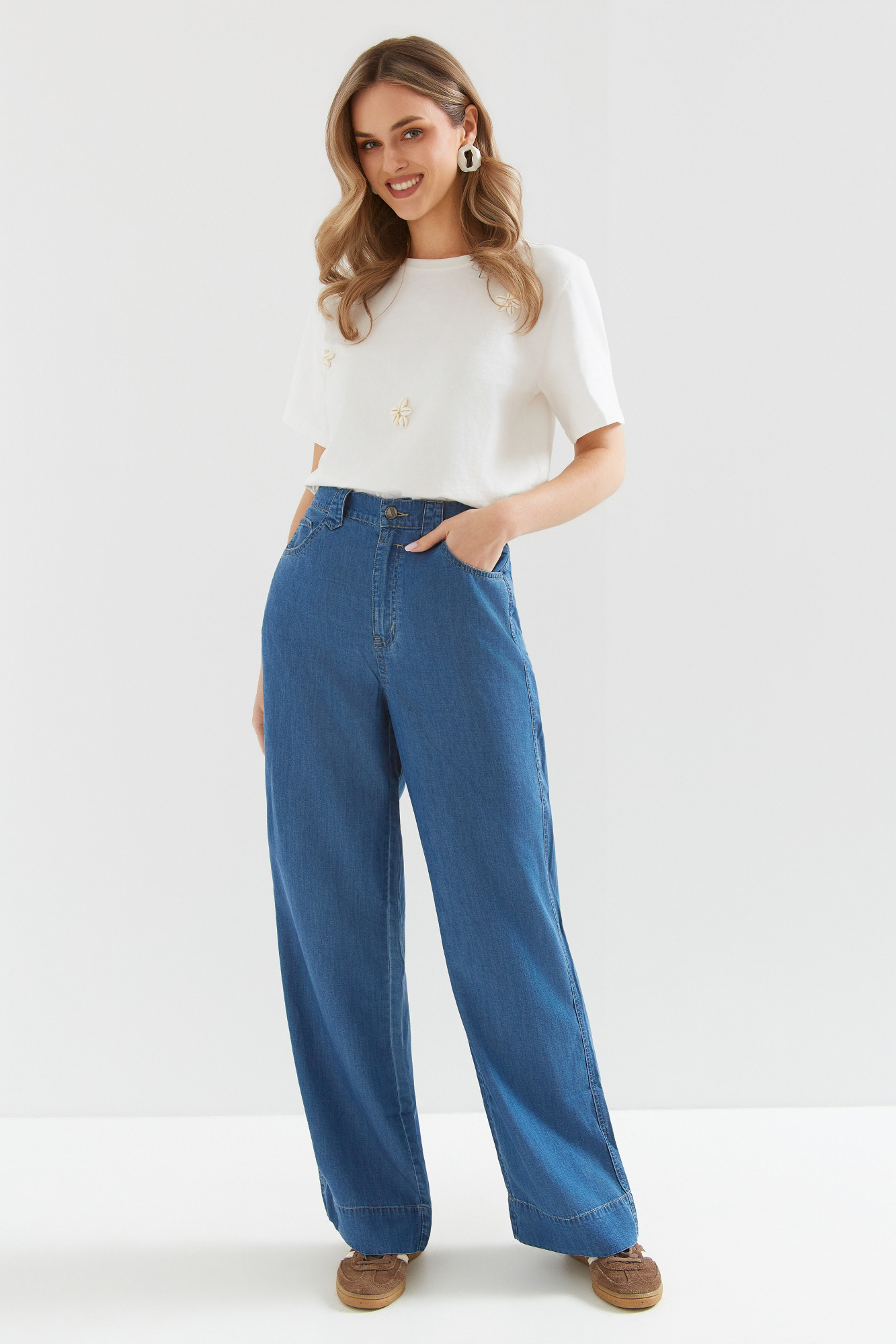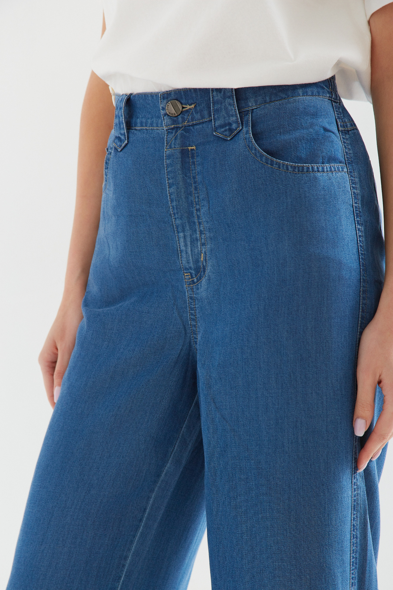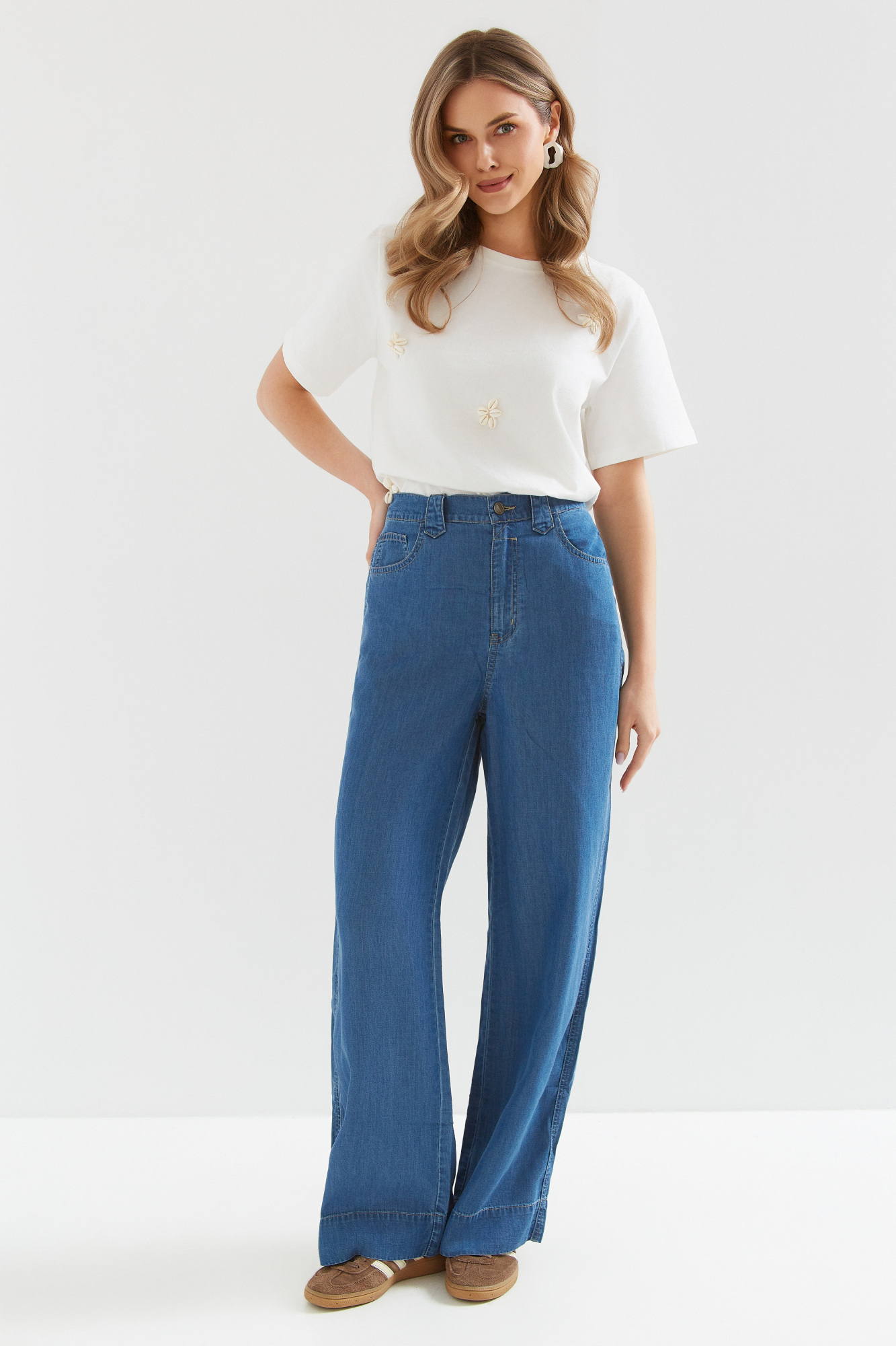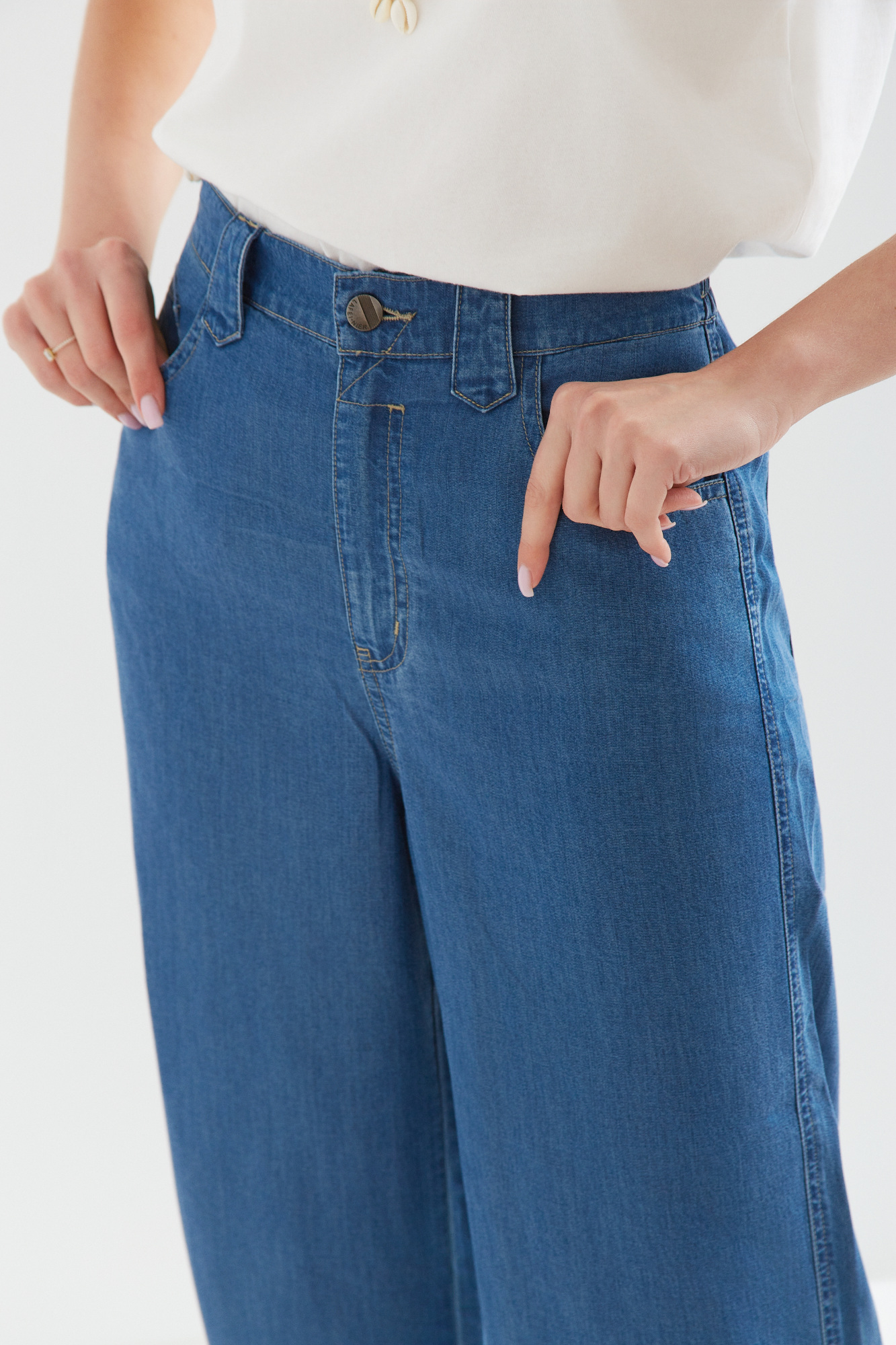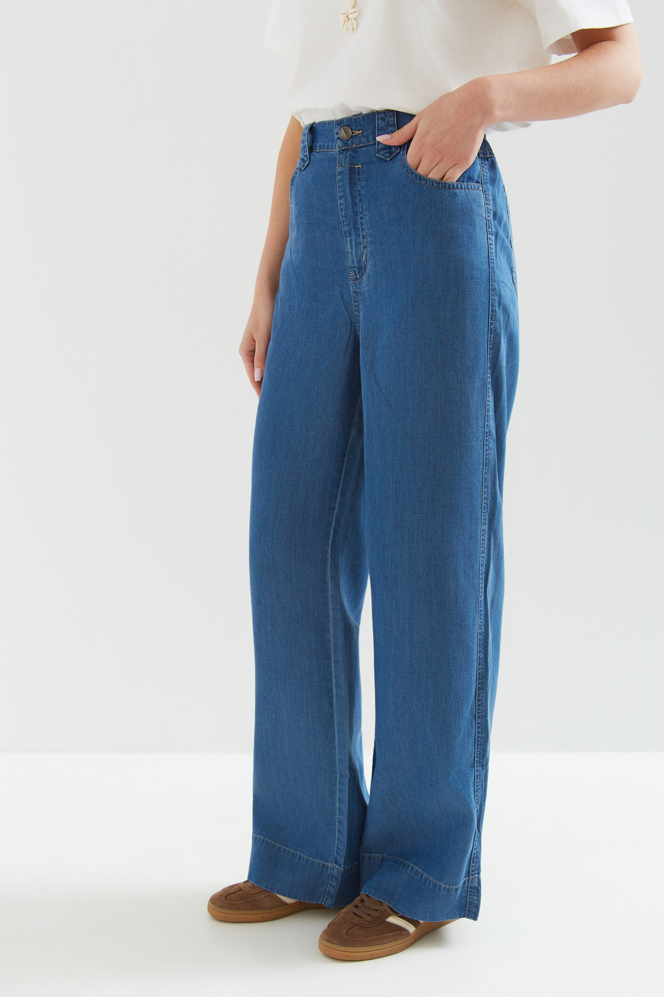 | Content | Spodnie z szerokimi nogawkami z lejącego cienkiego dżinsu (tencel nowoczesny ekologiczny materiał produkowany z celulozy drzewnej często eukaliptusowej), z wysokim stanem. Gumowa wstawka na tylnym pasku, gwarantuje wygodę w każdej sytuacji. Klasyczne kieszenie z tyłu. Materiał cienki letni. Dostępne długości nogawek to 76 i 79 cm. Preferowaną długość nogawek proszę podać w rubryce notatka od klienta. | Spodnie z wyższym stanem z grubszego dżersejowego materiału z ozdobną klamerką z przodu.