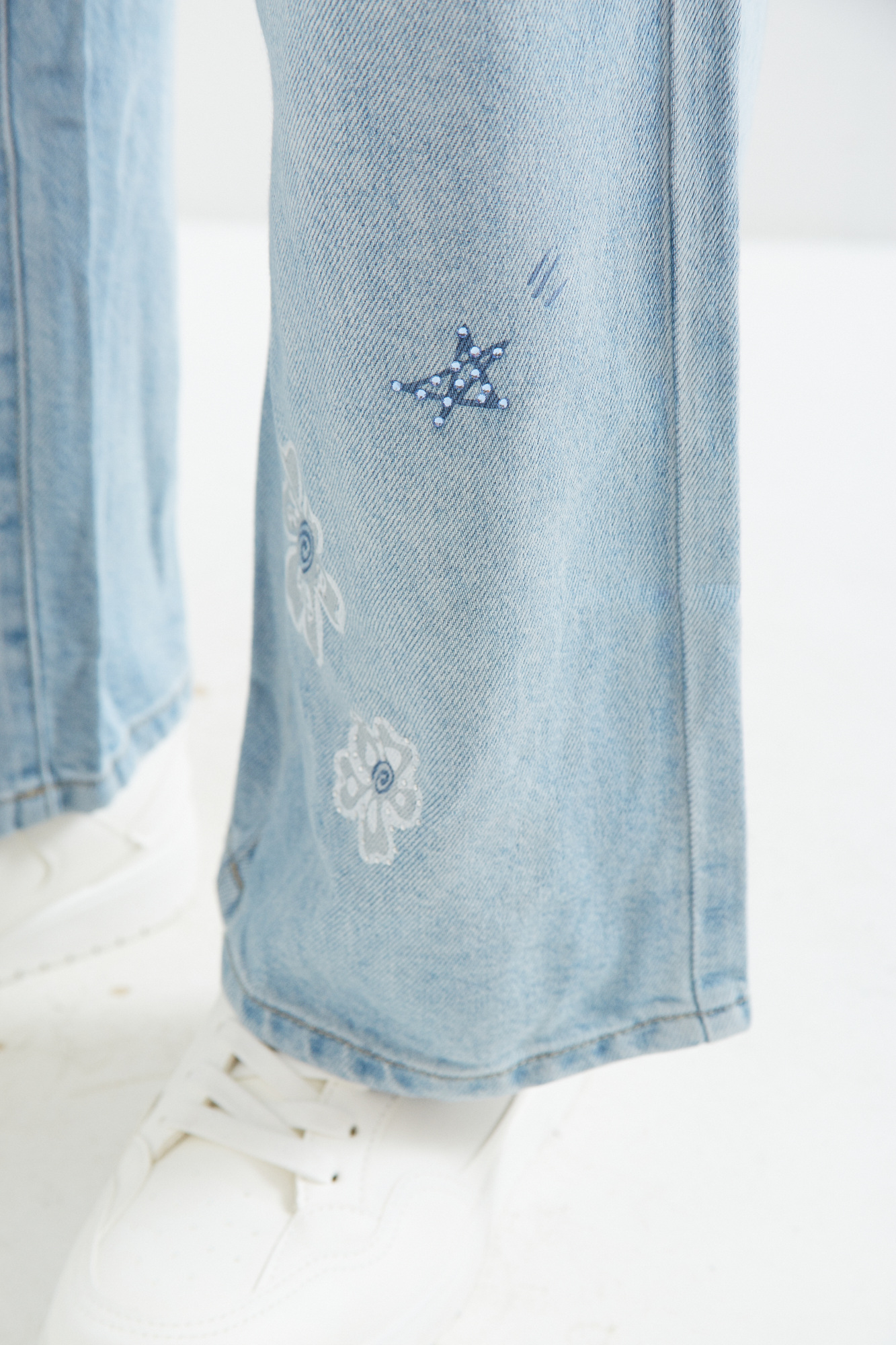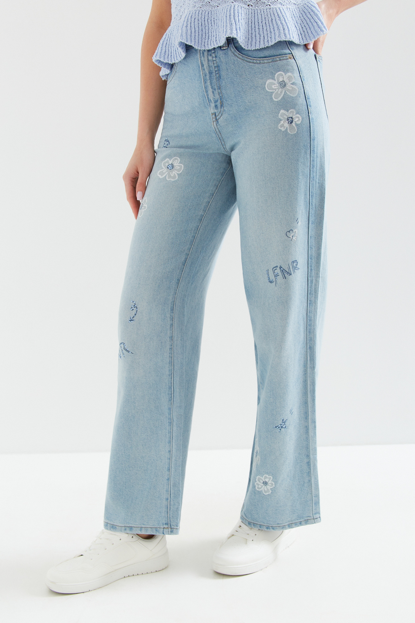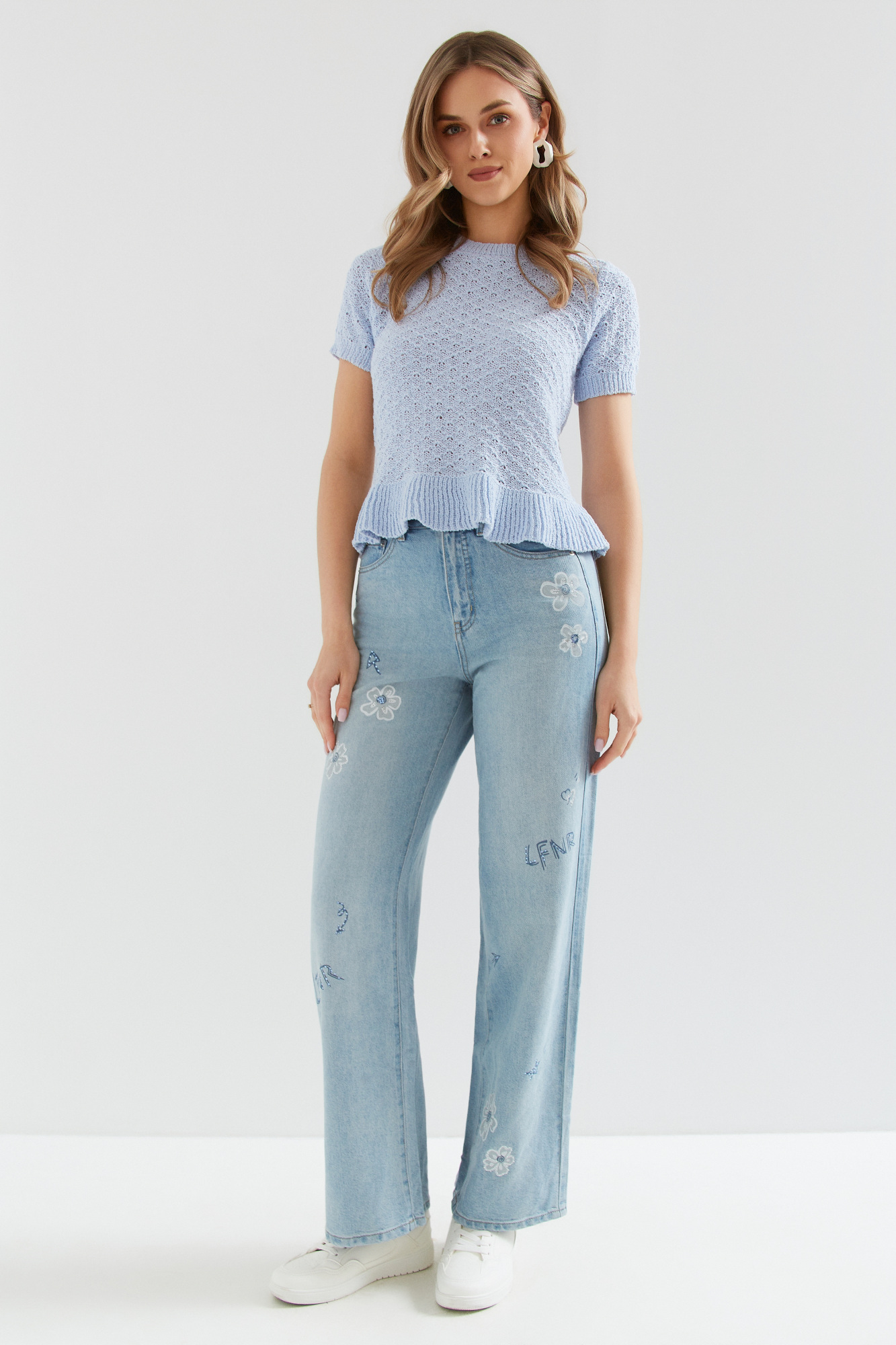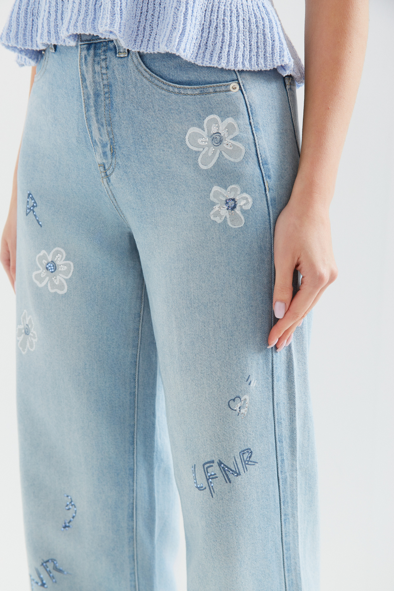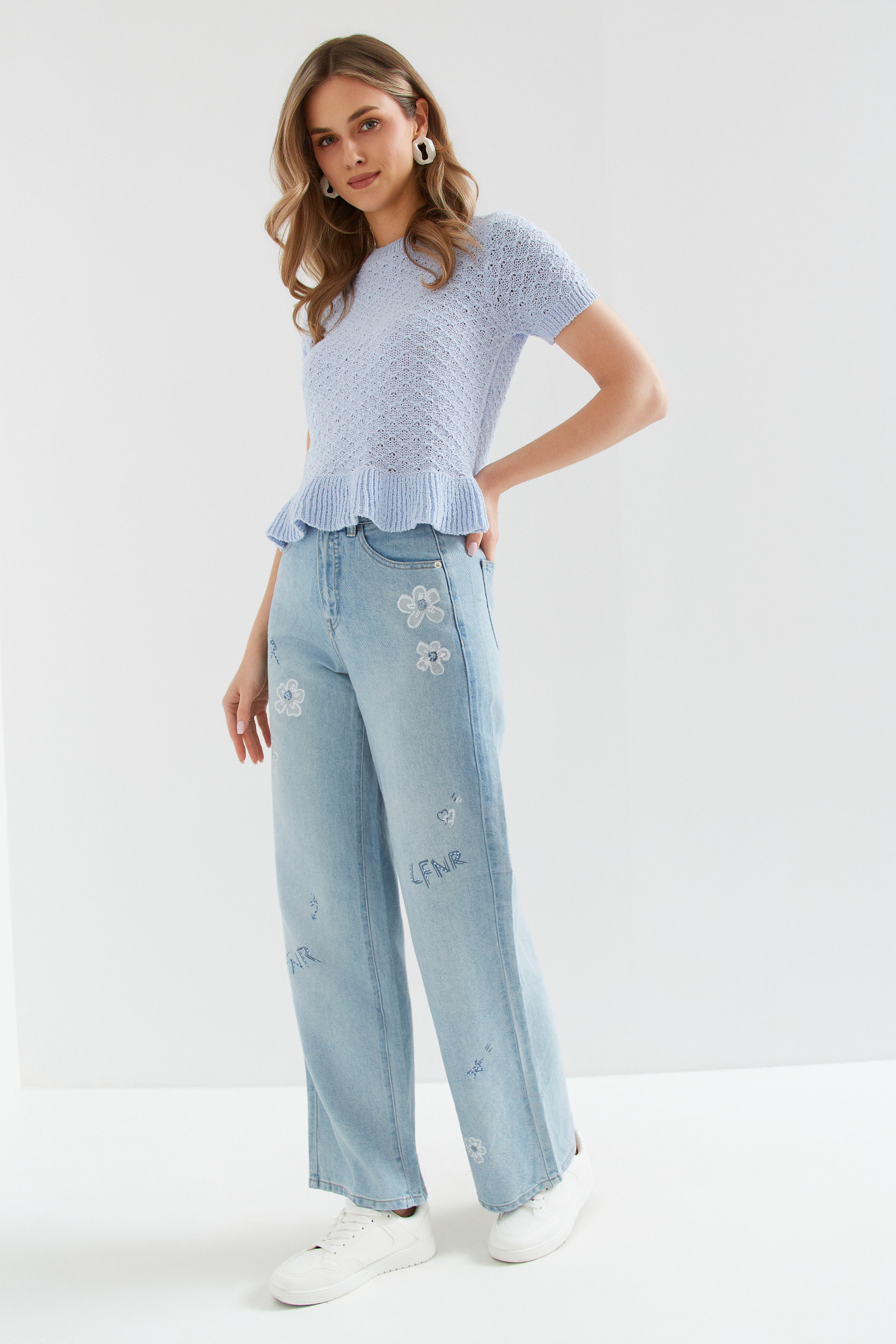 | Content | Spodnie z szerokimi nogawkami z tradycyjnego dżinsu, z wysokim stanem. Klasyczne kieszenie i srebrna skórka z tyłu. Całoroczny materiał, pokryty ozdobnymi nadrukami w postaci kwiatów oraz liter z cekinami w różnych kolorach. Dostępne długości nogawek to 76 i 79 cm. Preferowaną długość nogawek proszę podać w rubryce notatka od klienta. | Długie spodnie z wysokim stanem, z grubszego dżersejowego materiału, z logo marki na kieszeni z tyłu. Głęboki kolor burgundu. Preferowaną długość nogawki proszę podać w "uwagach".