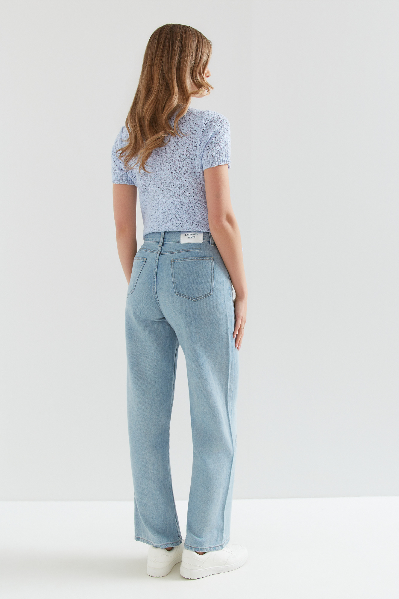 | Spodnie długie ze streczowanego cieńszego dżinsu z wyższym stanem. Spodnie przeszyte dodatkowo brązową nitką.